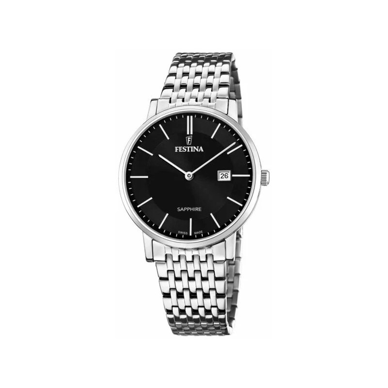 Bardzo elegancki męski zegarek na stalowej bransolecie. Czarny cyferblat chroni szkło szafirowe. Zegarek ma wodoszczelność 50m.
