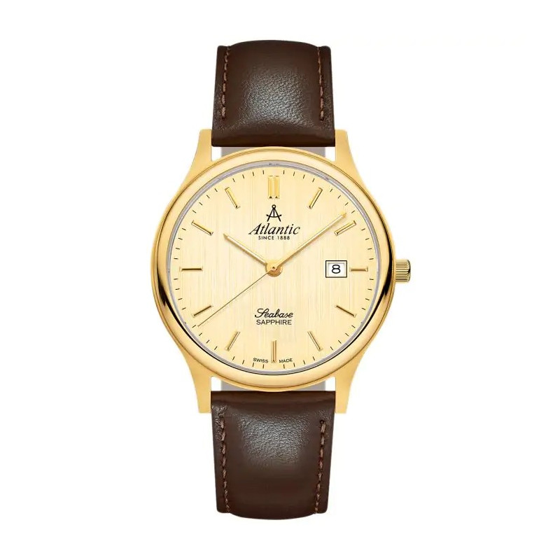 Elegancki model szwajcarskiego producenta z serii Seabase. Koperta wykonana ze stali szlachetnej, pokrytej złotą powłoką PVD, brązowy pasek skórzany, kwarcowy mechanizm na baterię, szafirowe szkiełko odporne na zarysowania, datownik oraz wodoszczelność 30 m.