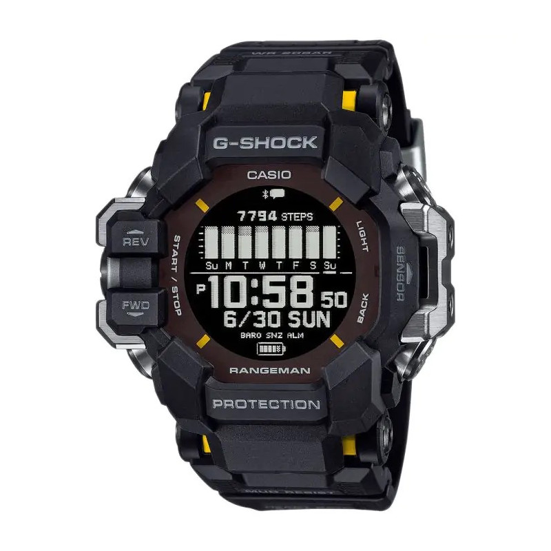 Casio MASTER OF G - LAND RANGEMAN SOLAR GPS 6 SENSORS GPR-H1000-1ER to trzecia generacja Rangeman. Jest odporny na naprawdę ciężke warunki, pełne wody, błota, pyłu i piasku. Wyposażono go w mineralne szkło, czarną kopertę ze srebrnymi, białymi i żółtymi detalami, obudowę z przyjaznej środowisku bio-żywicy, zabezpieczony przed błotem, kurzem i piaskiem, wodoszczelność do 20 bar / 200 metrów, łączność z systemem globalnej nawigacji satelitarnej GPS, optyczny czujnik tętna, pulsoksymetr, cyfrowy kompas, barometr, wysokościomierz barometryczny, termometr, akcelerometr, żyroskop, Bluetooth, rozbudowany stoper, cztery alarmy, czas światowy, tabela pływów, timer, kalendarz księżycowy, wschody i zachody słońca, wieczny kalendarz, tryb oszczędzania energii tryb samolotowy, alarm wibracyjny, czas pracy do 23 miesięcy, maksymalny czas mierzenia treningów to ok 19 godzin. Jest łatwy w obsłudze dzięki łączności bezprzewodowej i aplikacji w smartfonie, Mobile Link - automatyczne sprawdzanie dokładności i korekta wskazań. Ma ukryty grawer przedstawiający Kota Wyspowego, znak serii Rangeman.