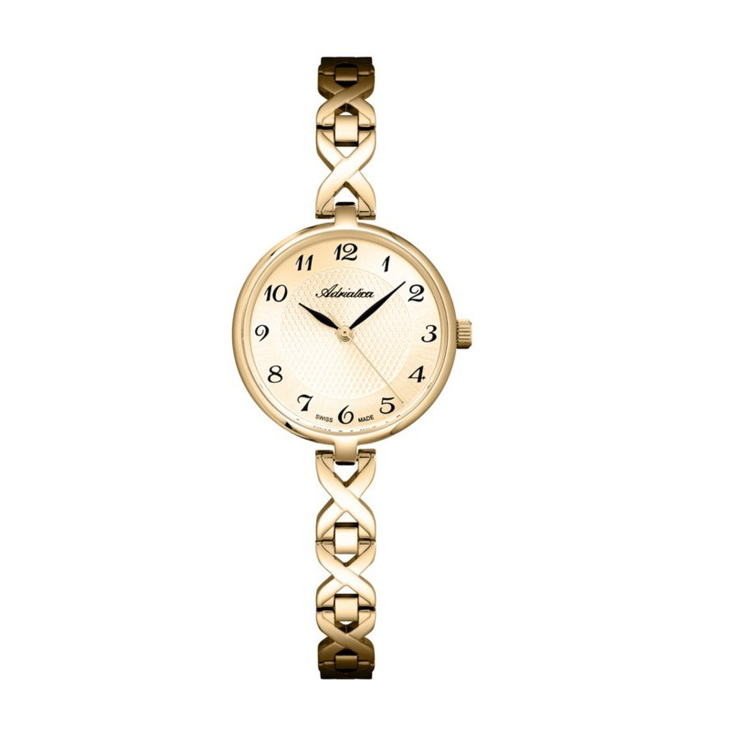 Damski zegarek o eleganckim charakterze. Koperta w kolorze żółtgo złota umieszczona jest na pięknej bransolecie w tym samym kolorze. Na cyferblacie umieszczono czytelne cyferki. Posiada precyzyjny mechanizm kwarcowy, zasilany baterią. Wodoszczelność tego zegarka to 30m.