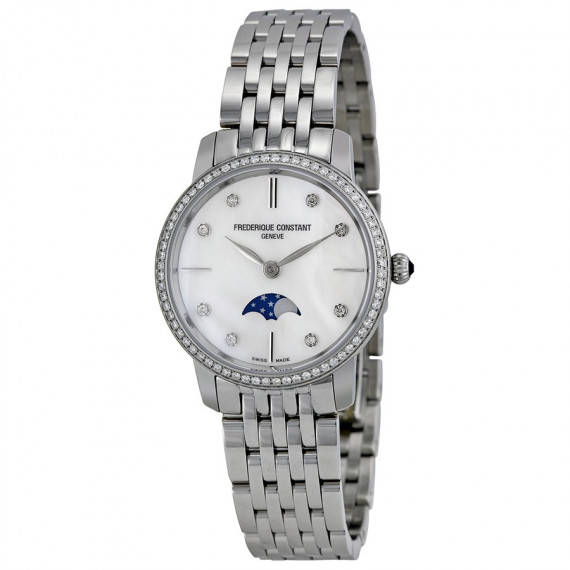 Zegarek z ciekawym designem z linii Slimline Moonphase. Charakteryzuje się wykorzystaniem masy perłowej na tarczy oraz diamentów na indeksach oraz pierścieniu. Koperta oraz bransoleta wykonana z najwyższej jakości stali szlachetnej. Szkło szafirowe odporne na zarysowania, wodoszczelność 3 ATM. Zegarek idealny dla kobiet ceniących sobie piękne dodatki, pasujący na każdą okazję. Dodatkowo na tarczy znajduje się mechanizm ukazujący fazy księżyca.