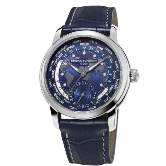 Wspaniały model zegarka, wyróżniający się obrotowym wewnętrzym pierścieniem, pozwalającym na odczyt czasu w wielu lokalizacjach. Pięknie zdobiona granatowa tarcza ukazuje mapę. Posiada automatyczny mechanizm manufakturowy - wykonany w 100 % w manufakturze Frederique Constant. Wyjątkowy czasomierz.