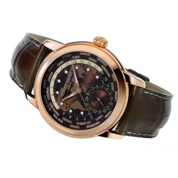 Wspaniały model zegarka, wyróżniający się obrotowym wewnętrzym pierścieniem, pozwalającym na odczyt czasu w wielu lokalizacjach. Pięknie zdobiona brązowa tarcza ukazuje mapę. Posiada automatyczny mechanizm manufakturowy - wykonany w 100 % w manufakturze Frederique Constant. Wyjątkowy czasomierz.