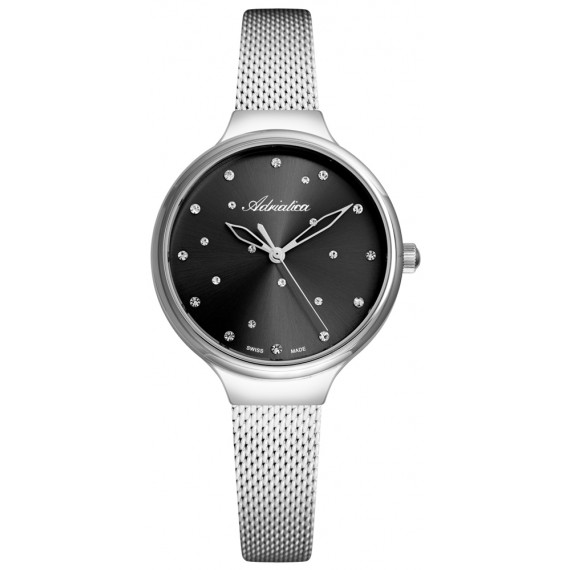 Elegancki damski zegarek z czarną okrągłą tarczą wysadzaną kryształkami Swarovskiego i na bransolecie typu mesh. Całość z najwyższej jakości stali szlachetnej w srebrnym kolorze. Zegarek posiada szkło mineralne oraz wodoszczelność 3ATM.
