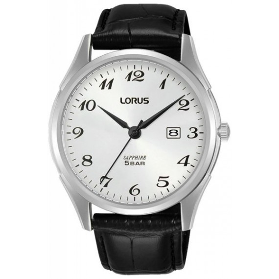 Elegancki zegarek na czarnym, skórzanym pasku. Na srebrnym cyferblacie umieszczono czarne cyfry i wskazówki. Całość zabezpieczona szkłem szafirowym i wodoszczelnością 50m.