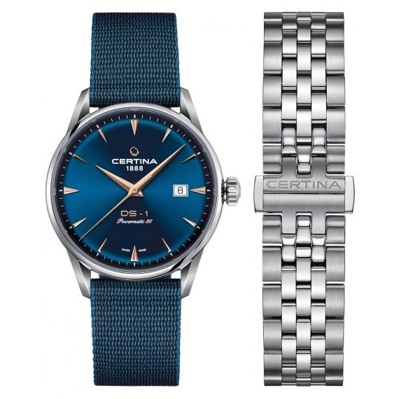 Zegarek Certina DS-1 należy do klasycznych eleganckich zegarków.Koperta oraz bransoleta została wykonana ze stali szlachetnej natomiast dodatkowo w komplecie jest niebieski pasek tekstylny - tide ocean material - który powstał z tworzyw sztucznych wyłowionych z oceanów. Posiada szafirowe szkło które jest bardzo odporne na zarysowania oraz datownik. Całość pracuje dzięki mechanizmowi automatycznemu z rezerwą chodu do 80 godzin a wodoszczelność jaką posiada to 10 ATM