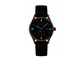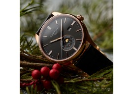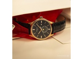 Certina Moon Phase dzięki swemu niezwykłemu designowi wyróżnia się spośród innych szwajcarskich zegarków. Koperta wykonana ze stali szlachetnej połączona zgrabnie z paskem skórzanym w kolorze brązowym. W zegarku pracuje mechanizm kwarcowy dodatkowo posiada datownik oraz fazy księżyca.