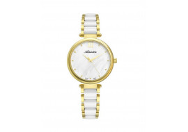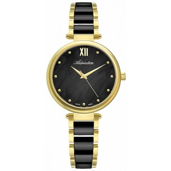 Elegancki zegarek idealny na każdą okazję. Koperta i bransoleta wykonane zostały z najwyższej jakości stali szlachetnej w złotym pozłoceniu połączonej z czarną ceramiką. Ceramika jako jeden z najtwardszych materiałów jest odporna na zarysowania. Tarcza zegarka wykonana jest z ciemnej masy perłowej. W środku pracuje niezwykle precyzyjny mechanizm kwarcowy. Całość zabezpieczona jest wytrzymałym szkłem mineralnym oraz wodoszczelnością 30 M.
