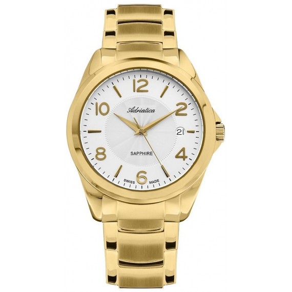 Klasyczny, elegancki zegarek męski. Cyferblat chroni szkło szafirowe oraz wodoszczelność 50m. Zegarek ma ciekawe połączenie kolorów, złota koperta ze stalowym cyferblatem umieszczona jest na bransolecie.