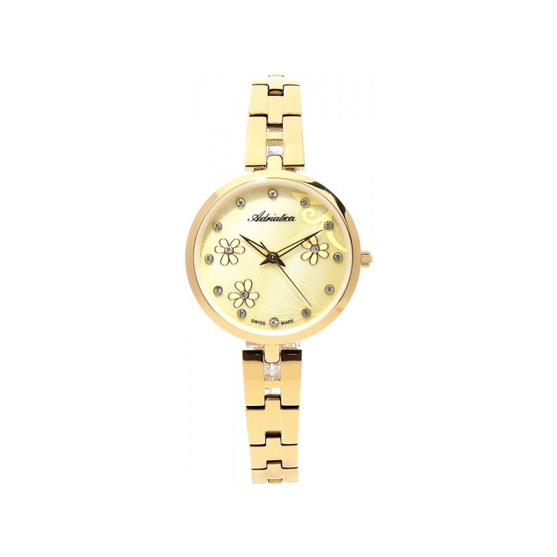 Damski zegarek w złotym kolorze o eleganckim charakterze. Posiada mechanizm kwarcowy zasilany baterią. Cyferblat z masy perłowej wysadzany jest cyrkoniami. Posiada wodoszczelność 30m.