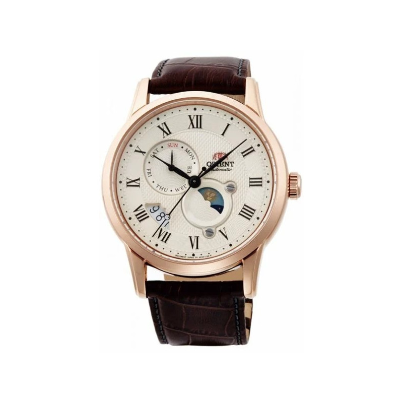 ORIENT Classic Automatic w wersji ze szkłem szafirowym. Na kremowej tarczy umieszczono rzymskie cyfry, datownik wskazujący dzień miesiąca i nazwę dnia tygodnia oraz fazy księżyca. Zegarek na pasku skórzanym w brązowym kolorze z zapięciem motylkowym, który pięknie komponuje się z jasnym cyferblatem. Zegarki z serii Classic Automatic urzekają ponadczasowym, bardzo eleganckim designem, troską o każdy detal oraz idealnym połączeniem kolorystycznym.